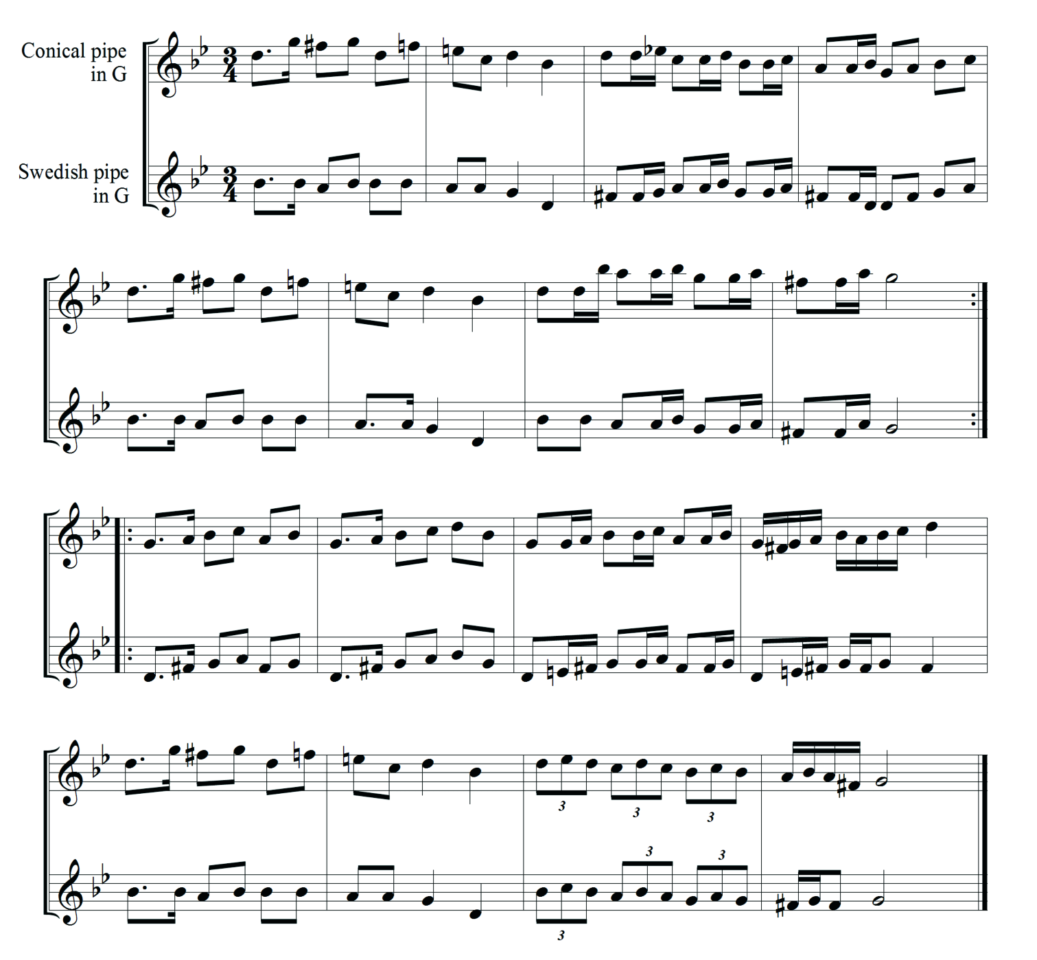 A few more things to note here: The difference of one whole note step from A to G changes the timbre quite a lot, and it works even better together with a conical pipe. Also, the naming changes because with Swedish pipes, we take the three-finger note as our starting point (G on what would be called a “D” pipes) and so a Swedish “G” pipe has the range D-d. Why is this? Simply tradition, and also because a vast number of tunes fit this range! We even find tunes that are called “Bagpipe tune” that aren’t playable on the pipes; they survived by means of fiddlers, who imitated drone instruments in their playing! And today, the circle is complete since we have used those tunes again to learn more about the old bagpipe repertoire…
