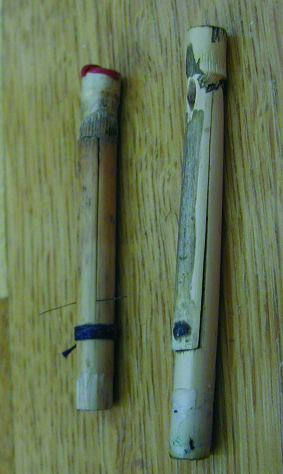 Even with Arundo donax reeds, however, many Swedish pipers struggle with their reeds on a daily basis. It is obviously a greater challenge to make single reeds work well for the full range of a chanter, than it is to make them work for the single note of a drone. This is a problem which the Swedish bagpipe has, or should have, in common with most East European bagpipes, but for some reason it seems to be worse for Swedish bagpipes. I can only speculate on why, but the narrow chanter bore, 6mm, might be one reason (possibly affecting stability). Another possible explanation is that many (most) Swedish bagpipe chanters were originally designed for Phragmites reeds. In any case, the full range of the chanter, a ninth or a tenth, is probably on the limit of what a single reed can handle, so the margins of error when making and adjusting reeds are very narrow.