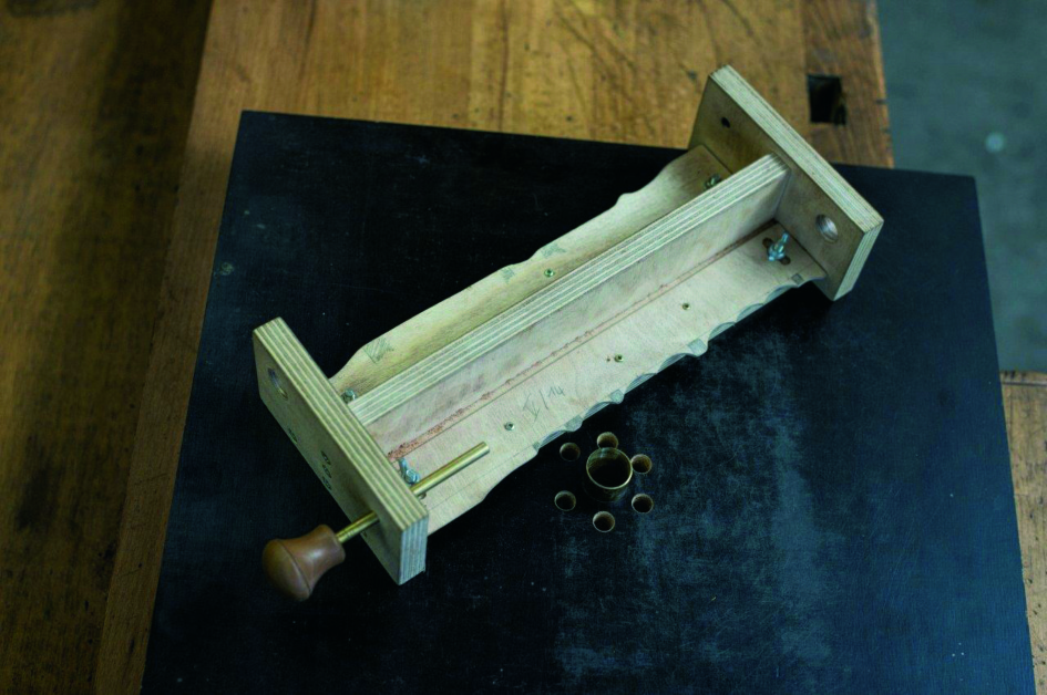This tube is used as a stop for the grinding jig. The jig itself consists of a template for the scallops at the bottom of the jig, and at the upper part a pin and a hole to set the chanter in. As there are scallops on both sides of the chanter, you need two templates, one for the front, one for the back.