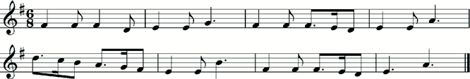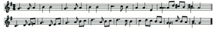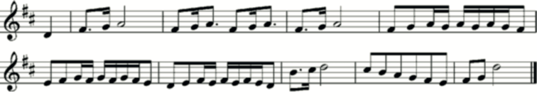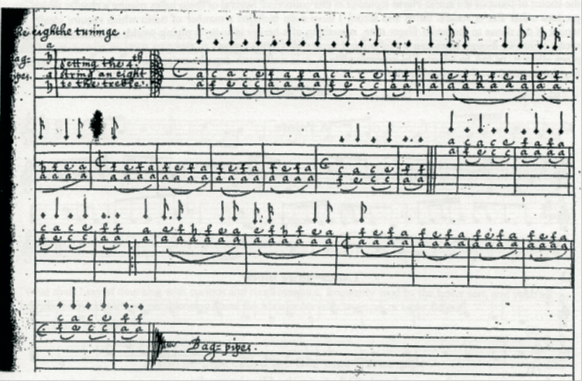 Fig. 2 is a transcription of the tablature in Fig. 1; ‘Bag=pipes’ from the ‘eighthe tuninge’; the entire piece here is repeated in the manuscript an octave higher; both times are accompanied by a drone a fifth below (G). This is different to the tuning Playford uses as his ‘Bag-pipe tuning. Here, the third string appears not to be played, the fourth and fifth strings tuned an octave below the first and second.