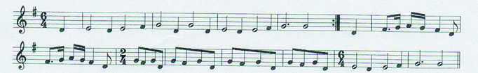 By good fortune a tune called ‘Chow Bente’ survives in two lute manuscripts from the period. This one (Fig. 22) is extracted from the tablature in Jane Pickering’s lute book (which carries the date 1616 though some of it may date from 1630-1650). The lute setting ranges widely over two and a half octaves, but the tune seems to be (as Ward suggested) a form of the ‘English Hunt’s Up’ (see Ward, 1979). I have included the closing cadence which is not strictly part of the tune but which displays the rhythmic concept. The tune also seems to be required for a ballad in a play performed in 1639 to the words ‘the great Choe bente/the little Choe bente/ Sir Piercy leigh under the line/ God bless the good Earl of Shrewsbury/ for he’s a good friend of mine” (Ward, 1979). It is a ‘galliard’ of the simplest type, which Arbeau calls ‘tourdion’. Here we have the familiar 16th century hornpipe rhythm, which Hawkins described as six crotchets, ‘four with a down, two with an up hand’ (see above), and which is clearly related to the Galliard’s four steps and a pause. However, Blundell’s poem has more to tell us: