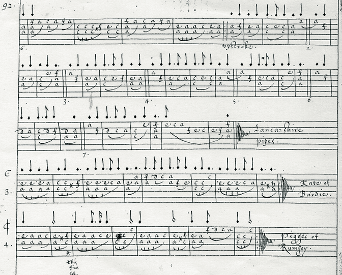 The two principle sources are manuscripts for the bass viol or viola-de gamba. The music at the top of this article is from the first of these, the anonymous manuscript now held in the Henry Watson Music Library at Manchester Public Library2; it is known accordingly as the ‘Manchester Manuscript’. It appears to date from somewhere between 1640 and 1660. The second manuscript is in the Chester Records Office3 and is the work of Sir Peter Leycester, antiquarian and Lord Lieutenant of Cheshire. His work is in the form of ‘A Booke of Lessons for the Lyra=viole’ and carries the date 1659. These manuscripts come from an area of the North-West of England well-known for its historical links with bagpiping and their compilers may have been known to each other.