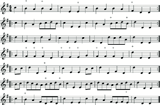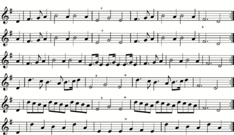 The remainder of the tunes in the Manchester manuscript come from the section of labelled ‘The seventh tuninge Lanca=shire pipes’, essentially the same as Playford’s. The manuscript has a ‘ninth tuninge’ labelled ‘Horn=pipe’, but the single tune given, though of interest as a hornpipe, spans an octave and a fifth and is not included here.