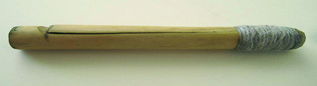 Probably the most distinctive characteristics of the Kaba Gaida is the type of reeds used. Djura gaida reeds are synthetic. Cotton phenolic material is used for the body of the reed and a clarinet type reed cut to size in order to fit the body. These type of reeds produce a louder sound and are not so sensitive to humidity and temperature changes. The Kaba Gaida reed is made from one piece of elder branch (normally 1-2 years old branches, gathered in the coldest days of the winter and dried for a year). The core is removed (it is naturally soft and easy to be taken out), the tongue is cut with sharp knife almost till the end of the reed but still the reed remains one whole piece of wood. Then cotton thread is wrapped tightly around for tuning purposes.