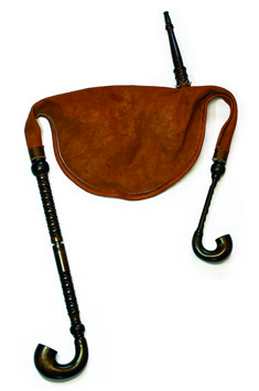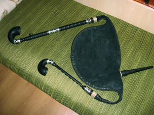 The Duda consists of a sewn bag (Meh) which looks like a goose with a long neck, with the chanter (Perabor) at the front end, a drone (Ghook) at the back and a blowpipe (Soska) on top. On the ends of the ghook and the perabor there are wooden bells (Ragovn ) which are directed upwards. When playing, a Dudar holds the perabor in front of himself the ghook is either hanging loose behind or is placed resting on the forearm.