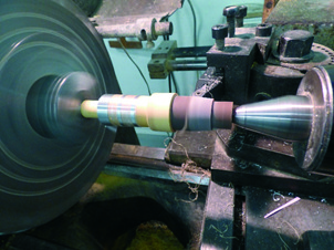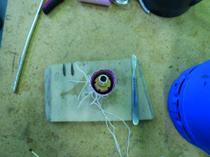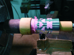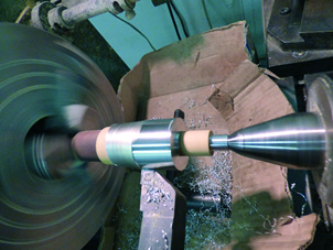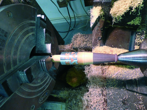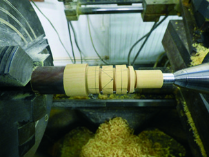 The next stage (picture 6), is to put the part back onto the lathe in order to remove the excess metal. The excess is saved and can be used for later instruments. As the part is turned, (picture 7), the decorative pattern is revealed, as well as the pink cardboard shield. The emergence of the cardboard is the signal to stop removing the pewter. It is important not to remove the extra thickness of pewter so that the design can stand ‘proud’ of the wood.