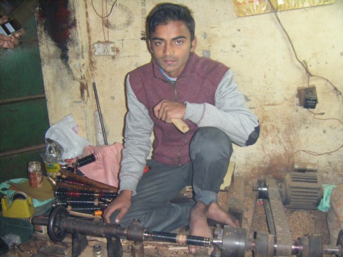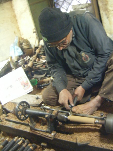 I showed him Peter Cooke’s photo from 1986 and he recognised the people, but clearly was not very interested and a bit dismissive about who they were. One of his sons later informed Ann that some of them were students of his father. He showed us a completed set of his pipes with aluminium mounts and then gave us a demonstration of turning a drone stock, which he does while squatting behind the lathe which is on the floor, guiding a gouge with both his hands and big toe.5. He uses Sheesham wood, 6. I which is hard, works easily and has the colour of light mahogany. After he completed turning he gave it a good sanding and then used a double-ended scraping tool. One end is the thread-chaser which forms the combing and the other forms the low bead in between the combing. I took a video of him working. 7. He works with the effortless confidence that comes with his many years of experience. But nevertheless it was alarming to see his trouser leg dangerously flapping against the unprotected flat belt. I needed to remind myself that he has been making pipes for 49 years and has still retained two legs….