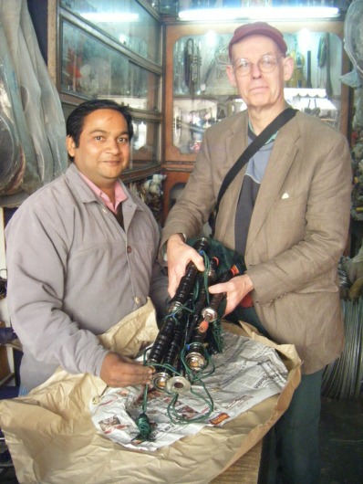 Later in the afternoon we walked up Jali Kothi to the shop of the Mehra Brothers Band Company. (That is the name written in Hindi above the shop in Peter’s photo). We showed it to the younger man in the shop who immediately recognised his grandfather and his uncle. I was pleased that eventually we had tracked down this connection and gave him copies of the photos. He told us that they don’t make bagpipes any more, but that they did have one in stock but we didn’t establish who made it. However he explicitly stated that there are no bagpipe makers in Meerut anymore. Judging from Saeed’s indifference to the photo there is obviously some history of rivalry and we thought it best not to mention our visit that morning to Saeed’ s workshop, which is only a couple of hundred yards away.