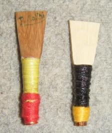 Before we left Saeed presented me with one of his new design of highland chanters. 12. I was very touched by this souvenir of our trip to Meerut. He had boxes of chanter reeds and I tried out three and chose the one I liked best in my new chanter. It is well made with a brass folded staple and is far superior to the awful Pakistani ones13. that were sold in UK music shops thirty years ago. The cane is darker in colour than European Arundo Donax and appears to be cut closer to the surface from outer layer of cane. The reed has a more traditional outside profile than is common in most conical bored instrument, and bears little physical relationship to the modern chunky wedge-shaped Highland reed.