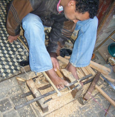 Eventually the pipe maker, Saeed Khan, arrived. When he was told we wanted to visit his workshop he looked a bit worried and said it would take a few minutes to tidy up. He must have rushed back and swept the whole place like a whirlwind because when he came back and took us to his workshop it was surprisingly tidy. We never saw any sacks of shavings, but we both enjoyed agreeing that an untidy workshop was a sign of a good workman! We were greeted by quite a gathering of men. Among them were Saeed’s three sons. The eldest, I suspect, was in his early 20s .They were keen to learn their father’s trade. We crowded into his workshop and were given chairs, which presumably had been supplied especially for us.