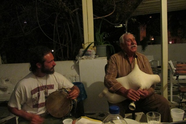 At its peak, he reckons there were around 50 active pipers on the island, but this has declined and there is now just a handful of the old players. There are young musicians rediscovering the traditions and taking up the tsambouna but it is not the same - modern society is very different and they do not have the soul or heart of the old players who were so central to local gatherings and ceremonies. There are also so many options now and no modern musicians seem to take up the tsabouna as their main instrument. There were never female players before the current generation; they would play the drum in accompaniment but that was all. Evgenia was of the opinion that a female voice was just wrong with the tsambouna and she felt that it lacked the necessary power and presence.