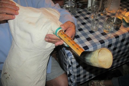 I asked about the non-return valve in his blowpipe and compared it with the Cretan Askomadoura, which is stopped by the tongue, making it impossible to both sing and play. I was told that up until his father’s time it was the same on Mykonos and before then pipers only played. The introduction of the valve changed this and now it is rare to come across a non-singing player.