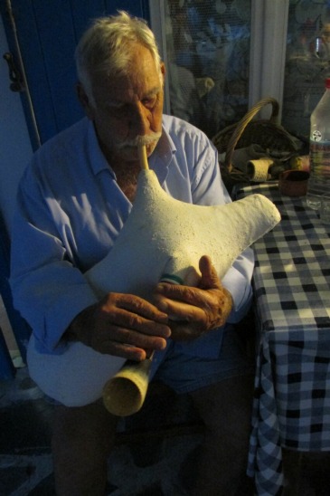 I first came across Dimitrios at the Paros tsabouna* festival in 2013. He was clearly a highly respected musician and he certainly cut an imposing figure on the stage with his “bull roar” of a voice and his ability to coax singular and expressive music from an apparently primitive pentatonic bagpipe. That was as far as it went as far as I was concerned. That was until 2015 when we were staying with our friend and tsabouna enthusiast, Evgenia Chanoti, on Mykonos who announced that Dimitrios would be arriving as a special party guest. He was very quiet to begin with and was content to sit back, eat a little salad and watch the other singers and musicians until he judged the time to be right and he unrolled his tsabouna from a carrier bag at his feet. For the next 2 to 3 hours we were treated to an almost uninterrupted stream of songs and tunes performed with a virtuosity and passion that was all the more remarkable for someone in his mid-eighties. This was not a ‘solo’ performance - he was at one with his “audience” who sang along, played percussion or danced as the mood took them. Inspiration flowed in both directions and the highlight for me was when a young Turkish girl started to dance in her traditional style, which encouraged Dimitrios to extemporise with ever more imagination and energy. Around midnight, his daughter arrived to collect him, he said his farewells and left. It had been a special evening, but my one regret was not being able to talk to him. Maybe another time…