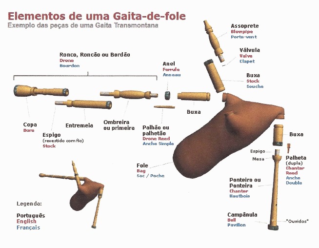 The gaita-de-fole consists of a chanter (a double-reed wooden pipe with eleven holes, eight of which are used to produce the melody), and one single-reeded large drone pipe that rests on the player’s left shoulder. Finally, through a blowpipe, the piper blows air into the bag, which is pressed under the player’s arm to provide a constant air supply to the melody and drone pipes. The chanter is played with three fingers of the left hand and four fingers of the right hand. Although the general designation used in Portugal is gaita-de-fole, regional designations are traditionally used (such as gaita transmontana, from Trás-os-Montes), and the term gaita galega is commonly used to refer to the bagpipes used in Minho, brought to different areas of Portugal by migrants from the bordering region of Galicia, or manufactured emulating the instruments used in that neighboring region of Spain. In some gaitas galegas a second or even a third drone is inserted into the bag.