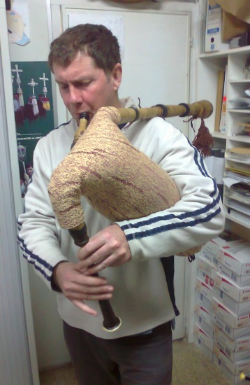 The construction of these pipes can be classified as having one drone that sits horizontally over the player’s shoulder. The drone is tied into the leg of a goat (skin bag) and this lets the drone to fall over the shoulder instead of it sitting up in the air. Today synthetic bags are used, but the shape still allows for this position. The drone and blow pipe are attached to each other by a chord, positioning the blow pipe in a comfortable position for the players mouth. The drone has 3 segments, the end segment with a “bell end” (a hollowed out cavity). The neck of the goat is for the chanter stock. The blow pipe uses the other leg of the goat. The chanter and drones were commonly made from boxwood, but other woods are used today (Santa Palo, ebony).