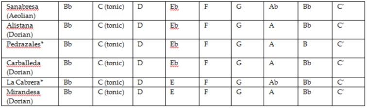 *Heptatonic Secunda Mode: Pedrazales (Melodic Ascending Minor); La Cabrera (Major Minor)