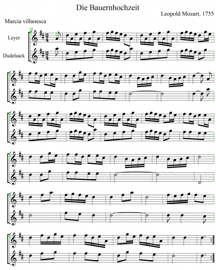 Not many people know that Leopold Mozart wrote for pipes and gurdy! However, the orchestral suite Die Bauernhochzeit (The Peasant Wedding) in Dmaj contains parts for horns, oboes, strings, leyer (gurdy) and dudelsack (hummelchen). The score is available on IMSLP. There are five movements: march, minuet and trio, andante, minuet and trio, and allegro, and the gurdy and pipes feature in the two trios and significant parts of the first and last movements.