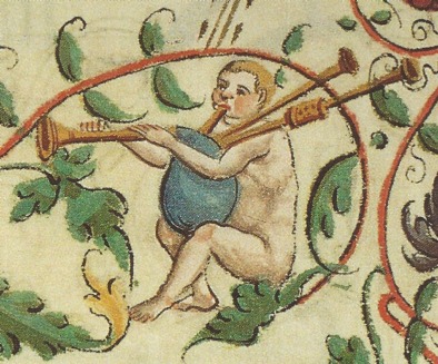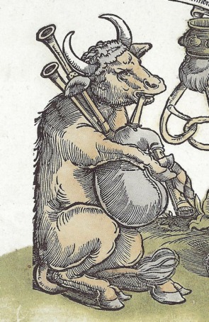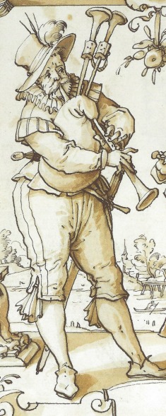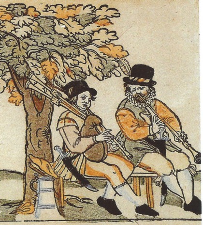 It is with my “curious mind” head on that I am puzzled by a particular feature shown time and time again on bagpipe illustrations from the late 15th through to early 17th century in Germany. The feature in question appears on the drone of the bagpipes, where one would expect the tuning slide to be but it looks, to all intents and purposes, like a fontanelle.