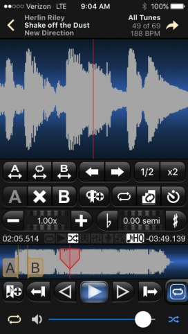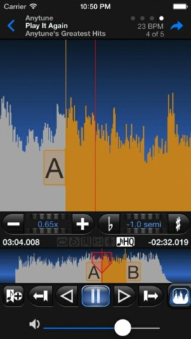 Having recently bought a new iPod, it occurred to me that there might well be a solution: use the the music library, open up a “slowdown” programme and tuck the iPod in my shirt pocket (or similar) or even better if you have a pair of those Bluetooth earphones. Hey presto, no trailing wires and less unnecessary noise to distract casual listeners from my wondrous playing, ahem. After a short search through the App Store, I came across Anytune, which does everything I wanted, and more plus … it’s free!