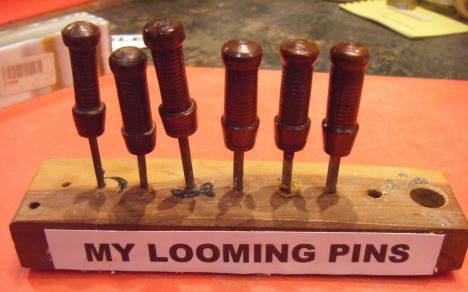 To make these I modified a set of clockmaker’s broaches that I bought at school when I used to mend clocks. A broach is a hand-operated tapered reamer that clockmakers use instead of a drill bit to increase the size of bearing holes in brass clock plates. Each one of mine was about 5 inches long, gently tapered and pentagonal in section (unlike an Allen Key which is hexagonal). The five edges are ground so that the edges are sharp enough to scrape minute amounts of brass when used to enlarge a hole. I cut some of these broaches into much shorter lengths and glued a mini handle on each one and have been using them ever since. Each one is a different section of taper and will remove a minute amount from the side of the finger hole. A great advantage is that they keep it circular and central to the original hole position. I love my Looming Pins!