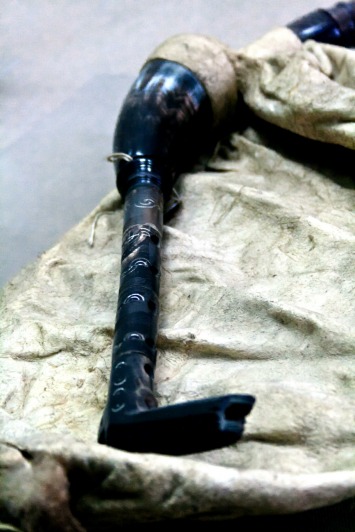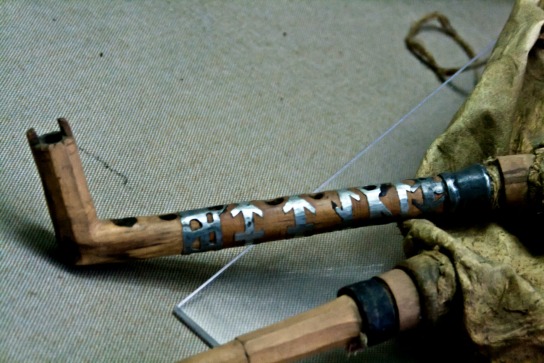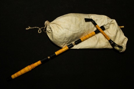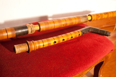 A gajda is made up of at least four parts: the bag, the blowpipe, the chanter and the drone. The bag is normally made with the skin of a sheep or a whole goat. It is said that the sheep is more suitable for a gajda in higher temperatures, such as summer, while the goat one is more suited to winter climates. The lower legs of the animal are removed and the skin is closed with a knot often made from the inside, although there are examples where it is on the outside. The stocks (in Macedonian glavini) for the blowpipe and the drone and inserted in the holes from the front legs and the chanter is inserted into a horn stock installed in the animal’s ‘neck’. The chanter (gajdanica or gajdarka) is traditionally a turned piece of boxwood decorated with characteristic ring motifs in horn. In the lower part of the chanter, a bell is inserted which is made of carved horn which carries the last two holes of the chanter. A side hole for the intonation of the lowest note of the chanter is pierced in the end part of the horn. It is thought that this is a remnant of an effective use of the entire horn of an animal, a characteristic that can still be found in other types of bagpipes from both the Mediterranean and Central-Eastern Europe.