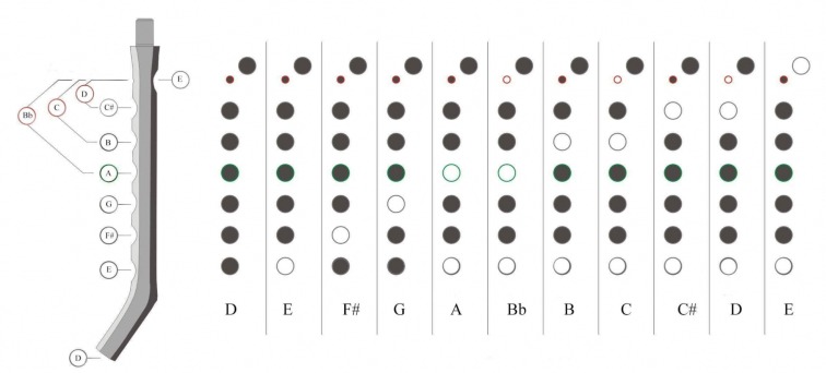 Another typical feature of the gajda is to have the tonic hole with four fingers of the left hand lowered. This arrangement of the intervals therefore allows the instrument to have an extension of a fifth up and a fourth down. Gajda uses a predominantly closed fingering, where the hands close all the holes and a single finger is raised corresponding to the hole of the note to be played. This technique allows a great speed in the execution of embellishments that involve the lower notes, moreover the lower sounds of the chanter are mixed with the sound of the tonic of the drone, thus simulating a staccato effect when playing. The Macedonian gajdanica (as well as the chanter of the Bulgarian kaba gajda) has a sort of inverse taper at the end of the chanter, which does not conflict with the predominant cylindrical bore (which is responsible, together with the single reed, for the sound of the chanter) but it helps differentiate the registers of the instrument. In practice there is a mixed technique where the closed fingering is alternated with semi-closed fingers so that the lower notes can be heard; for example in the execution of a lower mordent. In this case you will also raise your finger below the note you are playing.