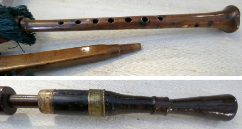 The pipes consist of three original parts, a tenor drone top, a chanter and maybe the blowpipe. These three parts do not have the same quality of turning as each other, so probably do not belong together. The wood is hard to identify due to its age. The drone top is conical and not dissimilar to older European images as well as being similar to the “Geordie Syme” pipes in Inverness Museum (6). It has a horn ferrule and there is no end cap. If there once was an end cap, it has been lost or its ‘absence’ might be a design feature. There is a metal ferrule halfway up which looks like a later add-on, maybe to assist a repair. The turning is quite crude. The chanter is of a lighter wood, which reminds me of yew or fruit, and it is of better quality than the drone that nonetheless has a really well-turned basal joint. The chanter’s low leading note (low G) has been drastically flattened with new holes, and of what look like the original holes, one of them is plugged with a piece of dowel. I assume that the opposite hole block has fallen out. The octave (high A), has also been modified, sharpened and the old hole filled with a dowel. The blowpipe is roughly square in section and doesn’t look anything like the other two parts. It is probably unrelated.
