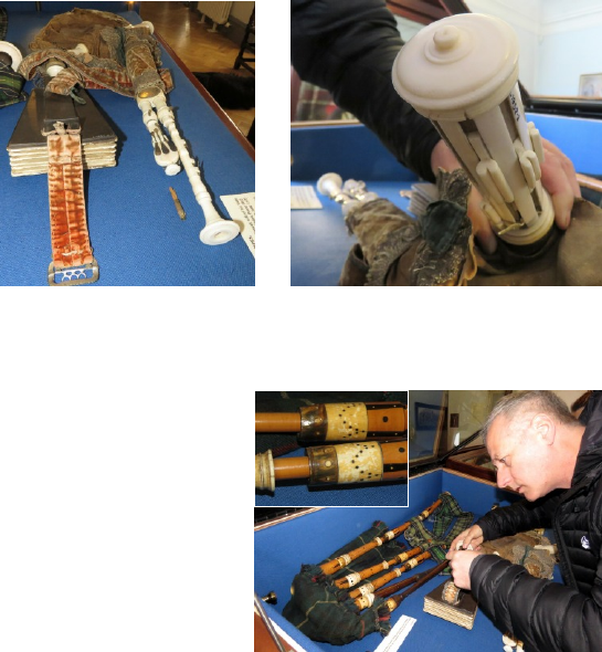 The rest of the collection – essentially four Scottish instruments, two of them 17-18th century – particularly interested Ross, who has commented on them with the enthusiasm they deserve. Now that more people are aware of their existence, perhaps they include researchers who would wish continue and refine this preliminary survey. Contact Ross (info@lochalshpipes.co.uk) or James (huntsup@theyorkwaits.org.uk).