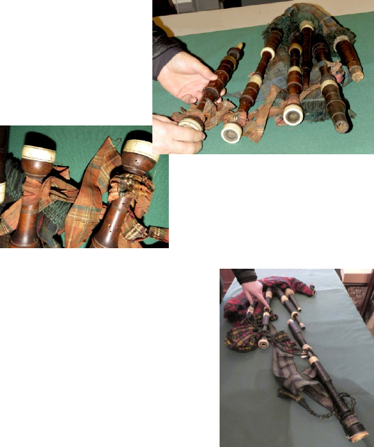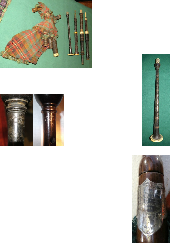Ross: According to Keith Sanger (5), these bagpipes date back to 1674, which would make them the oldest fragments of bagpipes in the UK. The rough outline of the story is that Donald Roy Macintyre was given by Campell of Breadalbane twenty-four pounds to go to Edinburgh for the purchase of some pipes plus forty pounds to learn his trade as a piper and four pounds for clothes. The pipes were passed down through the MacIntyre family until they came to Robert MacIntyre.