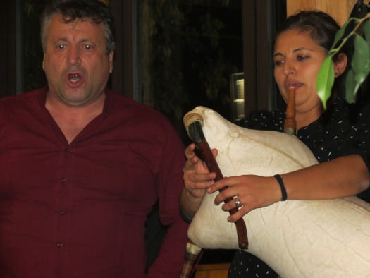The conference ended in the evening at a restaurant in the old town of Plovdiv where numerous pipers joined in for the celebration. The meal, consisting of salad, rice and mutton prepared especially for the occasion, was a real success. At regular intervals, a whole table would rise and bagpipes would get inflated, interpreting lengthy suites of riveting melodies, filling the restaurant with the sound of dozens of instruments. We heard songs accompanied by pipes, we witnessed dancing to the sound of a lone piper, we heard Petar Yanev serenading a friend, we were silenced by the virtuosity of Ivan Georgiev on the higher pitched djura gaida, we were overall humbled and deeply impressed by the warmth and talent of these Bulgarian pipers, men and women with large hearts and nimble fingers. As people left, Eric and I found ourselves sipping delicious raki until 2 AM, listening to an ever-decreasing circle of pipers, sharing our music and laughter.