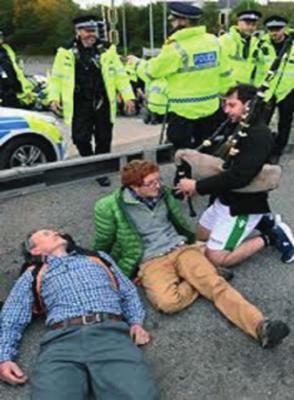 In another instance of the bagpipe being used as a means of challenging a protest, an incident involving protesters concerned about climate change was widely reported in the press. A group known as Insulate Britain had closed one of the busiest roads in the UK in an attempt to draw attention to the perceived lack of action by the British government in tackling the challenge of climate change. Insulate Britain staged the protest to demand that the UK government insulate all social housing by 2025 and retrofit all homes with state-of-the-art insulation by 2030. Outraged by the inconvenience the protest created for other road-users, an angry Scottish motorist got out of his car, took out his bagpipes and began playing in protest at the roadblock, kneeling provocatively in front of protestors who were sitting on the road. (See photo.) The event was captured in a video, which was then posted on Twitter. Police in attendance at the scene intervened quickly and moved the unnamed bagpiper away. Addressing his remarks to the camera, the man said: “They’re holding up ambulances, fire trucks.” However, Twitter users criticised the police for intervening to move the piper but not the protestors who had blocked the road. One user, Henry Jameson, said: “Playing the bagpipes is deemed more of a nuisance to the public than gluing yourself to the floor of a busy road and blocking all traffic.” Another, named Muriel Gray, added: “The police moved this piper chap on for ‘obnoxiously playing the bagpipes in the protestor’s face’. Well excuse me! Up here we pay good money for that kind of excellent entertainment.”29