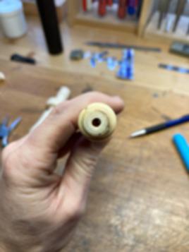 At this stage, all work on the outside was done so I could turn my attention to the bore. According to the other surviving musettes à ravalement, the bore is drilled in a few steps. The largest section has a 3.8mm bore, from the top to the upper ring at the bottom. This is roughly the length of a standard musette. The part with the three extra rings has a slightly larger bore, going from 3.8 to approximately 4.2mm, and then you have the (missing) bell. By enlarging the bore here, you can tune the lower notes. A wider bore raises the pitch.