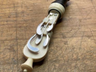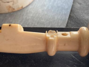 In 2017, a fourth musette à ravalement showed up for sale, at an auction in Vichy. It was badly damaged and incomplete, only a part of the grand chalumeau survived. All of the keys and the bell were missing, the bore had been enlarged and 4 key blocks were ripped off. Perhaps by someone who wanted to melt down the silver keys.