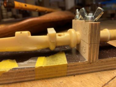 On this instrument, someone had enlarged a section of the bore to a 6mm diameter. I turned a new piece of ivory with a 3.3mm pilot hole, and glued it in the chanter. The next day I drilled again with a 3.8mm gun drill and reamed with a conical reamer made from a steel rod.