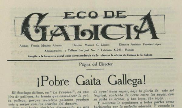What happened on Sunday in "La Tropical" has no name; it was a real defeat for the regional gaita. A young man from Ourense, who by the cut of his clothes showed that he had just arrived in these lands, was the bagpiper. He was a very well-known and appreciated young man among his compatriots; cheerful, jocund, "boisterous"; with that joy and good humour characteristic of Galician youth, and which is the most resounding lie to the reputation of being gloomy and hermetic hat fantasy novelists have given us. (…) The gaita wanted to be played again, but the stridencies of the metal and the booming of the timbalero, marking the first bars of a danzón, silenced it definitively. (…) The Galicians waited impatiently for the other danzón. The echoes of the gaita, which sang nearby, said nothing, sounded like nothing, did not reach the hearts of those sons of Galicia. Poor alician bagpipes! The bagpiper made a gesture and let his gaita deflate, the last sound of which sounded like a sob…