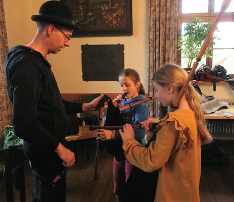 Matthias Branschke constantly browses manuscripts discovered in the last years, for tunes either suitable or adaptable for bagpipes. The challenge for this particular project was to find something easy enough yet still interesting, as the levels of the participants varied from advanced beginners to rather experienced musicians. A special challenge for most of the kids and teens was to learn without sheet music – and they all coped very well!
