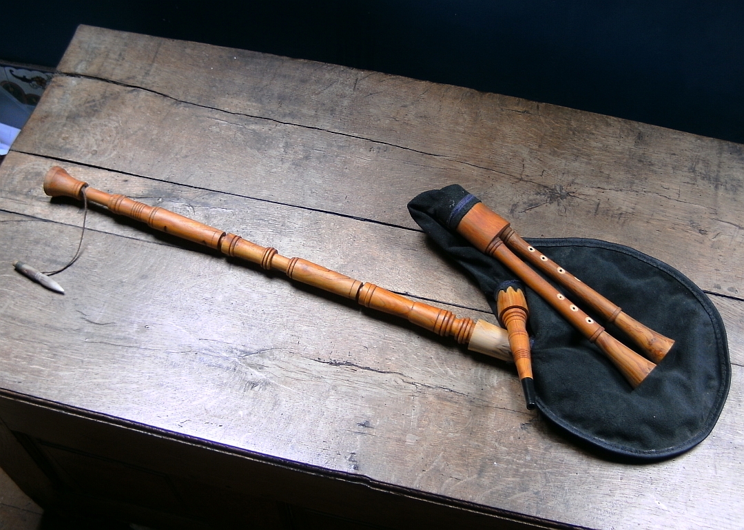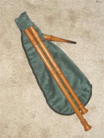 These English Double Bagpipes have a single chanter that contains two bores. The finger holes are arranged so that one can produce simple harmonies and counter melodies. The pipes usually have a single drone. They are fairly quiet with a gorgeous tone.